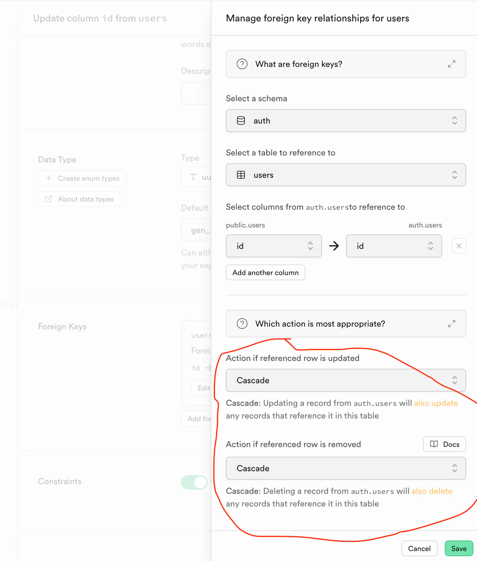 Supabase offers automated reference updates/deletions when a user is removed (see attached picture).
