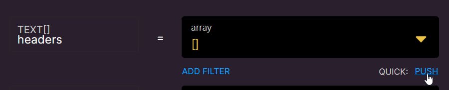 Headers are an Array so in order to add something to the headers we can use the PUSH filter which adds an item to the end of an array.