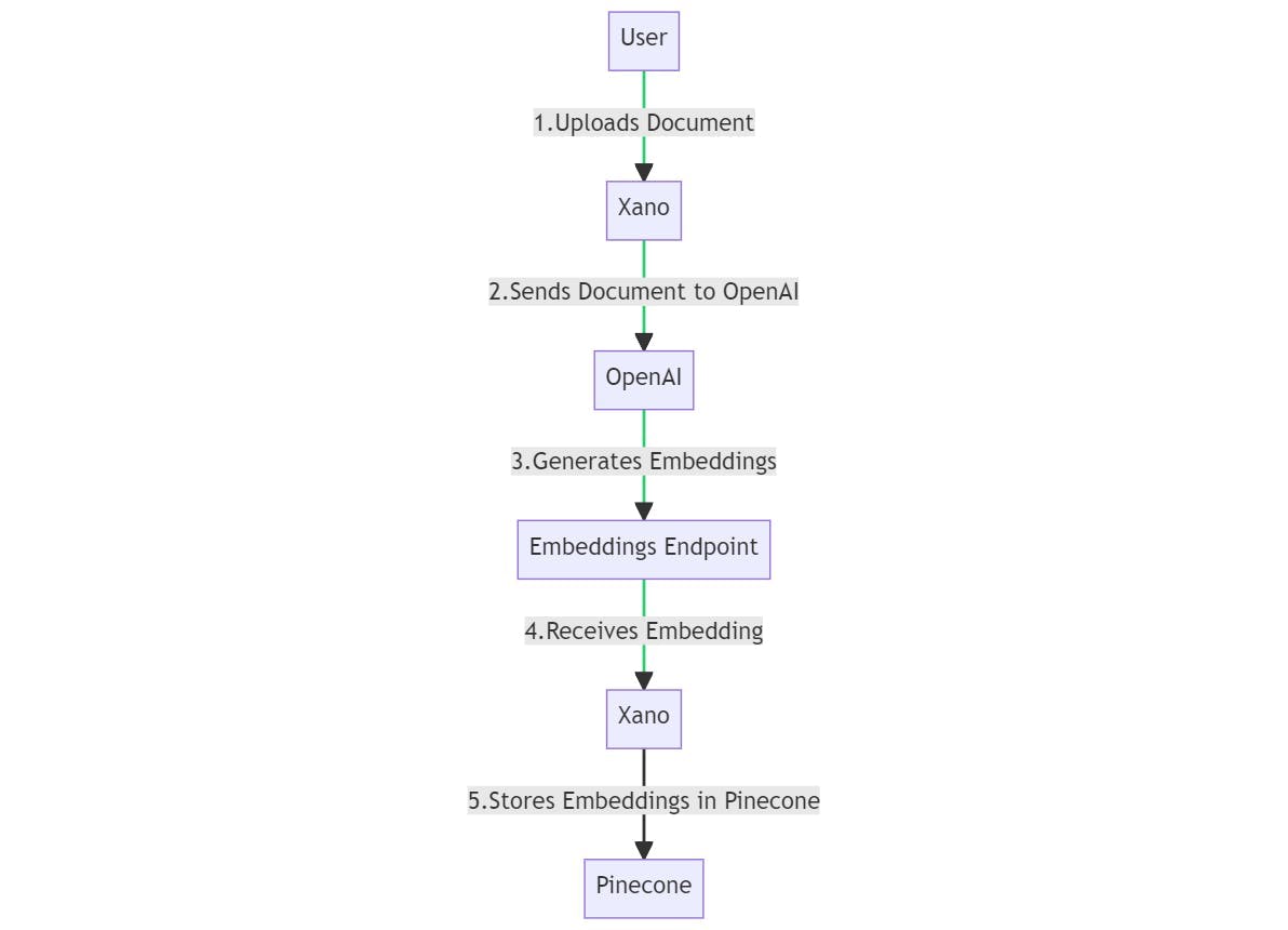 For example, you could generate embeddings for your product documentation or knowledge base using OpenAI's API. Then you could store those embeddings in a vector database like Pinecone and use Xano to query the database to create a chatbot trained on your own data. The chatbot could handle questions about your products and documentation using the semantic information captured in the embeddings.