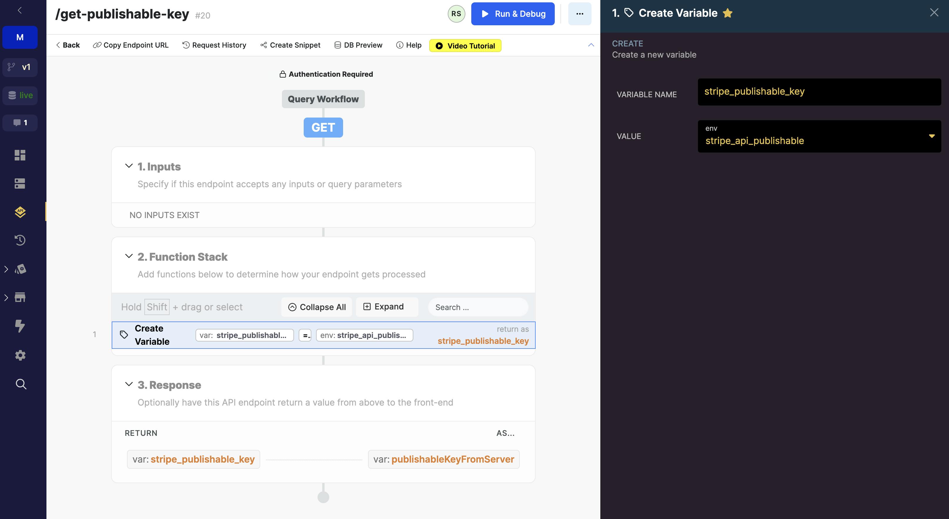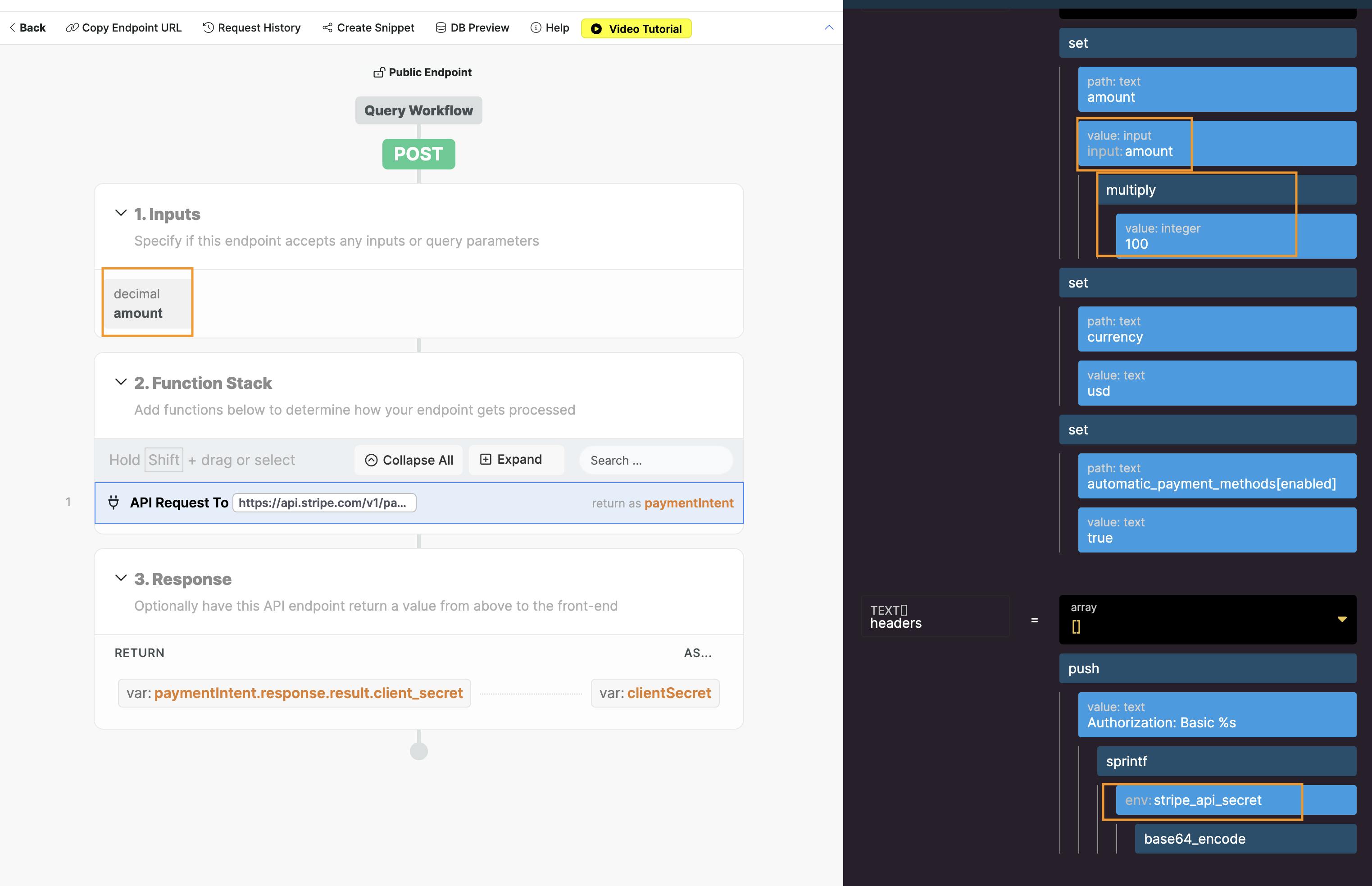 § You will need to make two changes: instead of a placeholder amount, specify an “amount” as an input of your function stack; instead of hard-coded api key, specify you secret key that you saved as an Env variable.