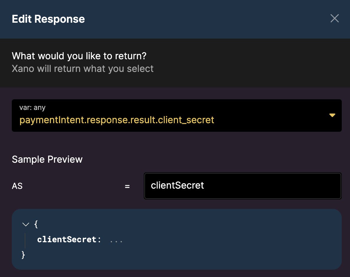 § As you make this call to Stripe, it will return a whole payment intent object with a bunch of stuff we don’t need at this point, so for our purposes your Xano endpoint can just return clientSecret.